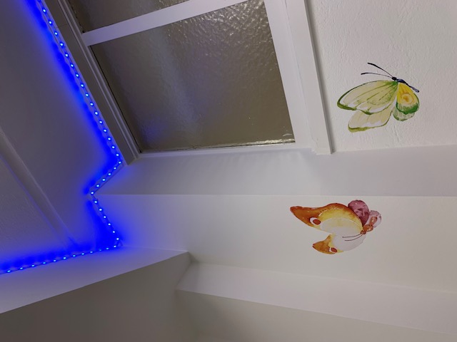 Zuerst tauchten wie von Wunderhand kleine Pflanzen und Duftbehälter auf. Danach wurden die Wände verziert, ein Wichtel brachte LED Licht an, welches bunt wechselt und der Höhepunkt: eine Geräuschbox macht fröhliche Waldgeräusche. Wenn man mucksmäuschenstill stehen kann und der Bewegungsmelder das helle Licht ausgehen lässt, dann kann man alles auf sich wirken lassen.