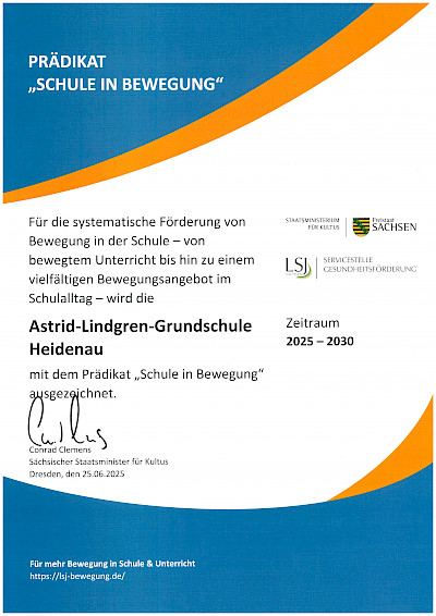 Sportliche Angebote spielen in unserer Grundschule eine große Rolle, so wurden wir im Jahre 2007 mit dem „Sportgütesiegel“ ausgezeichnet, im Jahr 2009 als „Sportfreundliche Schule“ und erhielten das Gütesiegel als „Bewegte Grundschule“ 2013 zum zweiten Mal. Zahlreiche GTA-Angebote sind im sportlichen Bereich zu finden. Im Jahr 2024 haben wir uns für das Zertifikat "Schule in Bewegung" beworben und es erhalten. Mit den Schwerpunkten: angeleitete und bewegte Hofpause, unseren Schulweg meistern wir zu Fuß! und intensiver Fortbildung unseres Teams haben wir das Zertifikat erreicht. In einem gesunden Körper wohnt ein gesunder Geist - Bewegung ist der Schlüssel für gutes Lernen! Davon sind wir überzeugt und wenn eine Schule Sport, Aktivität und Bewegung im Focus hat, dann WIR!